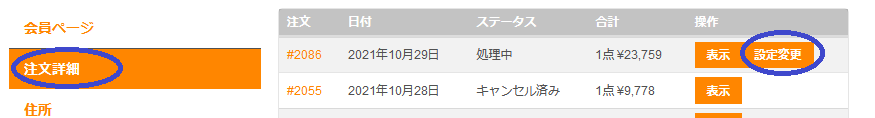 該当の注文ナンバーの「設定変更」ボタンをクリック